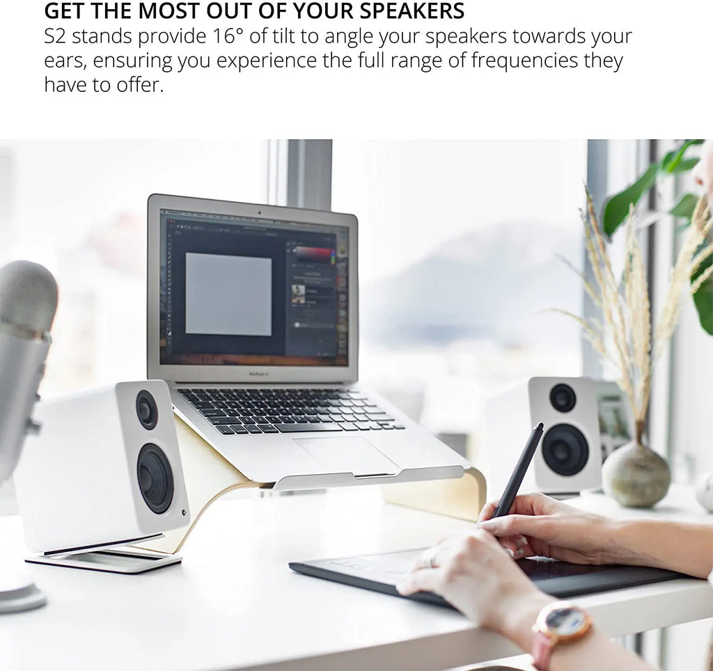The 16° tilt angle directs sound toward your ears for balanced, detailed audio and improved clarity. Foam padding on both top and bottom helps stabilise the speakers and minimise vibration or resonance.