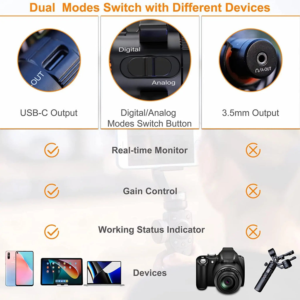 Switch easily between analog (3.5mm TRS) for cameras and digital (USB-C) for smartphones or laptops, ensuring full compatibility across devices.