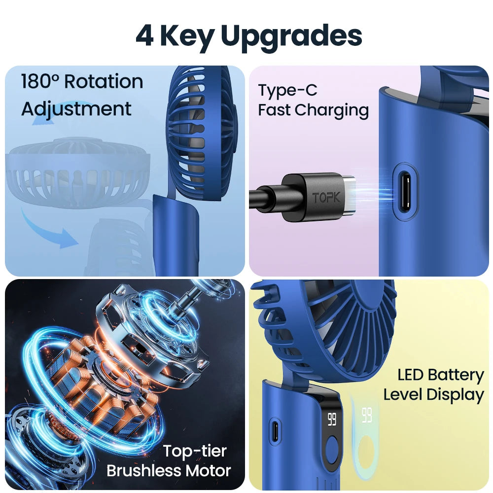 This portable handheld fan combines long battery life, versatile positioning and compact design, making it a practical cooling solution for daily use and travel in warm weather.